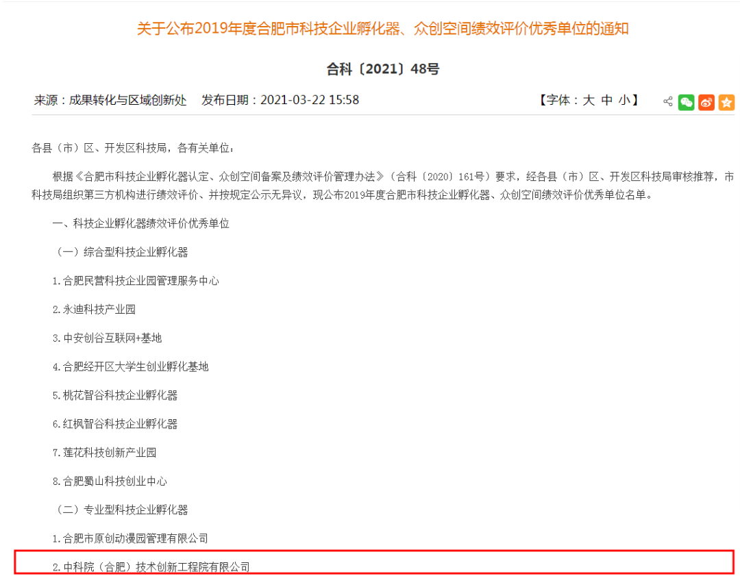 继获评2020年度高新区优秀孵化器之后,中科院合肥创新院孵化器又获新荣誉!近日,经审核推荐、绩效评价、公示等程序,2019年度合肥市科技企业孵化器、众创空间绩效评价优秀单位名单新鲜出炉!合肥创新院成功上榜专业性科技企业孵化器绩效评价优秀单位!据悉,此次仅有两家专业性科技企业孵化器被评价为优秀!